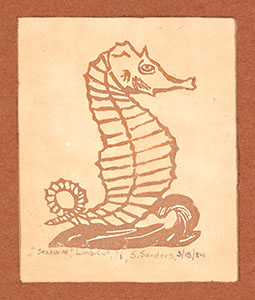 | See Details (update) | DSF0693 (view large size) | Seahorse | 3/15/1984 | 4 inches high 3 inches wide | Lino Cut | 1/1 | Shannon Sanders |